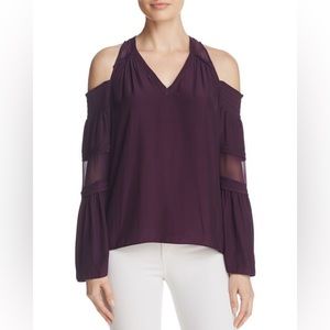 Gorgeous cold-shoulder wine/Merlot colored blouse in silk blend crinkled chiffon with sheer inserts by Ramy Brook. A feminine, fun and flirty designer piece to last you many seasons!