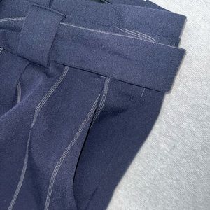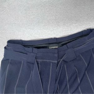 Express High Waisted Paperbag Ankle Pant. Women. Size 10 Regular. Color navy with white lines. High waisted with hidden hook and zip fly closure. Paperbag waist with removable sash belt. Slant front pockets. Ankle length. Gently used. No stains. No alterations. Purchased new from Express. 70%Polyester/25%Rayon/5%Spandex. No odors. Stored in a pet free and smoke free environment.
