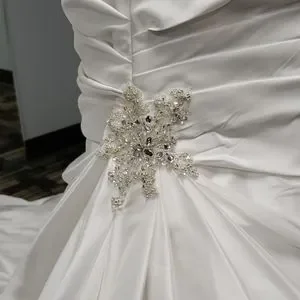 Hello! Is this white or ivory? The material in the back appears to be a little loose, or is that perhaps just a unique camera angle? It is a beautiful dress! I love the bling on top!