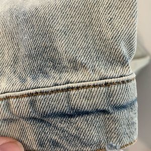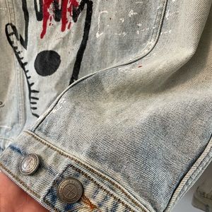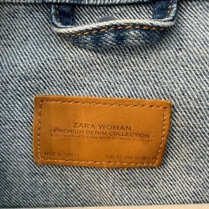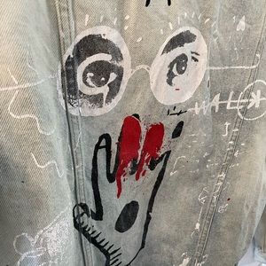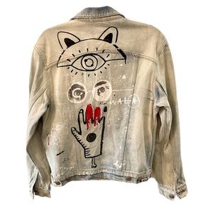 Zara Graffiti Art Oversized Distressed Denim Jacket in size XS. In EUC, with several small faint spots shown up closely in pictures. This premium denim jacket is truly a work of art! Comes from a smoke-free, cat-friendly home. Measurements are included in pictures. Please inspect pictures closely and let me know if you have any questions!