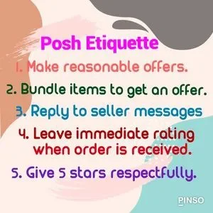 Posh etiquette makes the poshing experience positive and seamless for sellers and buyers. Leaving immediate ratings ensures the seller gets paid timely and leaving a love note is encouraged as well. Bundling your liked items is a way to let a seller know that you’re interested in receiving an offer. Always leave a 5 star rating as long as the item is as described, received safely and timely. If you’re not happy with the items please communicate with the seller before leaving less than 5 stars, or a negative love note, to resolve the issue. Posh ❤️ to everyone!