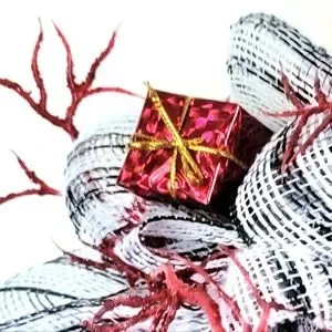 This wreath features a plush Jack Skellingtin and a central metal plaque -both Genuine Disney- deco mesh ruffles, a dapper bow, faux presents and creepy red glitter vines.