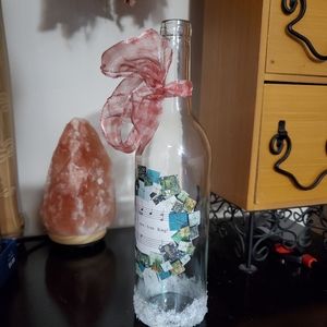 A Christmas winter themed decoupage collage on a with twinkle lights. Red white organza bow. A fun holiday piece