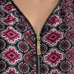 Three quarter length sleeve blouse with zippered v neckline. Contrast material on the bottom. Made of 100% polyester and in great used condition.