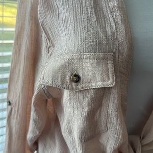 NWOT. Tie knot closure, long or 3/4” sleeves. Color: cream w/a pink cast