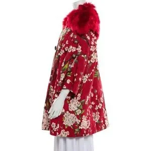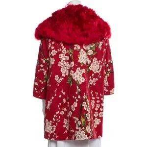 Dolce & Gabbana Red Jacquard Coat with Cherry Blossoms and Fur Collar