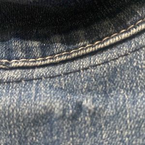 There are no stains; however, there is one small tear to the left of the label. I believe it was sewn since it barely shows on the reverse side. Other than that, it’s in excellent condition.