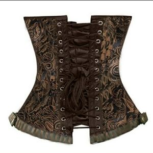 Striped bone/rods to keep in placebustier retro brocade Victorian Striped golden bronze brown sexy corset, clasp side closure with back lace up for cinching, Gothic style corset with a zipper side brocade jacket for decoration, vintage and classical corset, panties included. Wear to a party or daily outerwear, Steampunk themed, cosplay show, or casual wear. Can't go wrong with this corset order two sizes up from your usual size. Go off of your waist size when ordering not breast, ●follow the size chart I've provided no signs of wear use or damage mint condition excellent quality stunning piece perfect with jeans