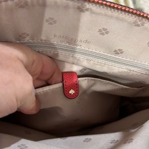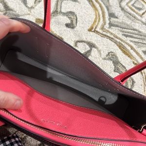 Kate Spade, salmon, pink leather, large size satchel style bag has two large compartments on the outside. Also has a zipper pocket with one large pocket, grapefruit phone or wallet, as well as a zipper pocket. The bag does have a few areas of discoloration and somewhere on the bottom four corners and also needs a replacement metal part for the zipper non-smoking home fast delivery at an excellent price. Get it today.