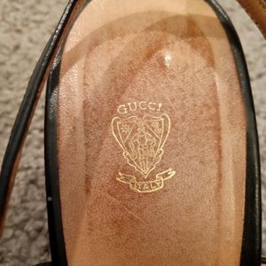 Gucci Italy Vintage Gold Bit Black Red Leather Sandals Heels Slides Shoes sz 38 B, good condition, normal minor wear, Gucci vintage insignia shown in full on inner heel. Slingback adjustable style. Gorgeous Gold Horse bit accent. Foot pads affixed but can be removed. Amazing and classic sandals! Will ship right away. Check out my other vintage shoes consolidation