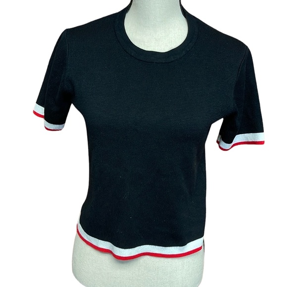 In excellent condition size Small Zara knit crew neck short sleeve top. Red and white stripe accents on the sleeves and hem. Side slits. 74% viscose, 26% polyester