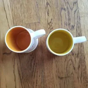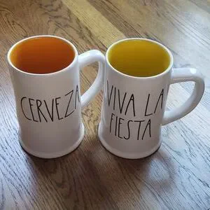 Brand New Rae Dunn Artisan Collection by Magenta Set Of 2 Beer Steins. One Cerveza Beer Stein with orange interior. One Viva La Fiesta Beer Stein with yellow interior. Wider base than top. Very sturdy, well built, heftier than I thought they would be. Would make such a cute gift set. Perfect addition to any home bar, and a great gift to the beer lover in your life!