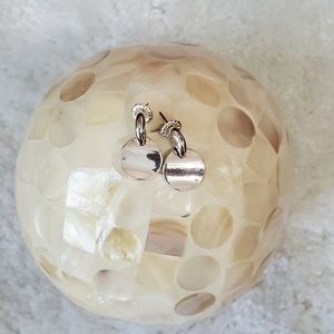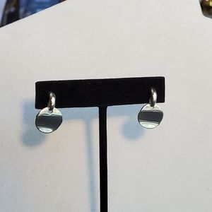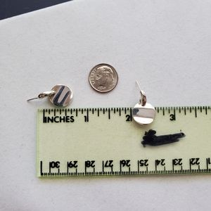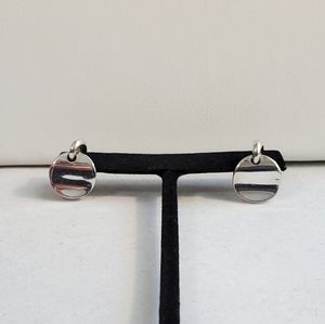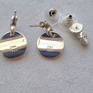 These lovely sterling earrings by ZINA feature dangling wavy round charms that catch the light and reflect beautifully. While the charms dangle freely, they are a permanent part of the earring (NOT removable). A post and butterfly back holds each earring securely. I am including new sterling butterfly backs as well as large plastic backs with metal centers. One post is slightly bent, and although it doesn’t affect the fit of the earrings, I encourage you to examine the close-up picture of the bend which I’ve included in the listing’s array of pictures. Marked 925 ZINA, these earrings measure approximately 3/4” long and about 1/2” wide across the dangling charm. They are in Good Used Condition. Please see all pics for details, condition, and size comps.