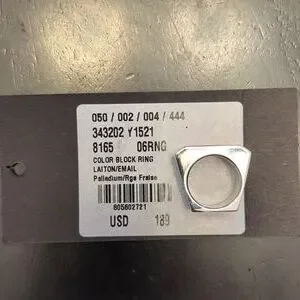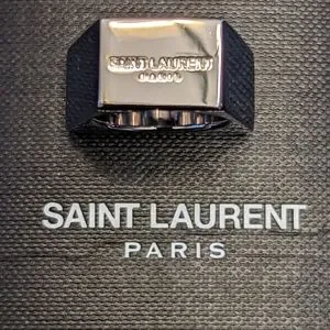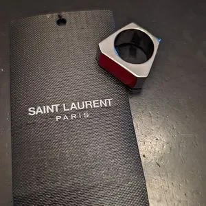 Silver Yves Saint Laurent Color Block Ring with red enamel. Size 6. Faint scratching to some edges.