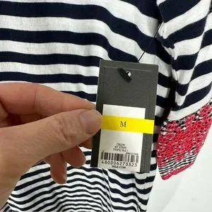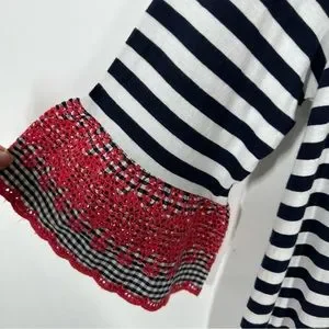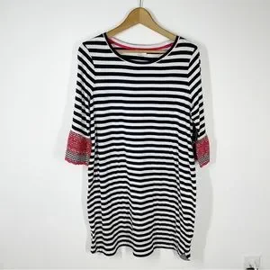 Crown & Ivy Navy Blue and white Striped Knit Dress. Embroidered Bell Sleeves. Small flaw on front, see photo. Chest 21” length 36”. Size Medium.