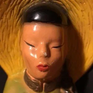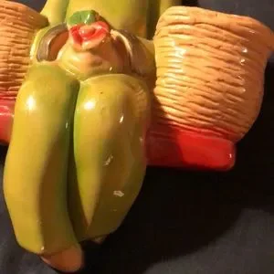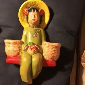 Pair of Vintage Asian man and lady wall pockets. 1940s-50s check photos for some paint missing. Not chipped. Small chip on back side of shoe. See photo. Can be used for candle holders, air fern, or just to decorate your wall.