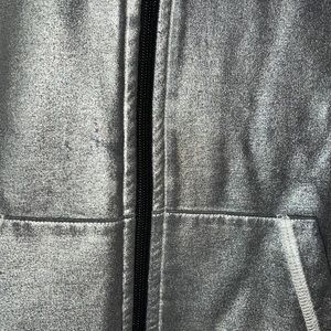 Pink Victoria’s Secret 2014 Runway fashion show zip up hooded drawstring jacket. Size small. Silver metallic shimmer finish with a lime neon green lining inside. Has “Pink” written in black down the arms. Two front pockets. Has the Pink dog logo on the chest. Black Tapered Cuff and Hem Drawstring hood.