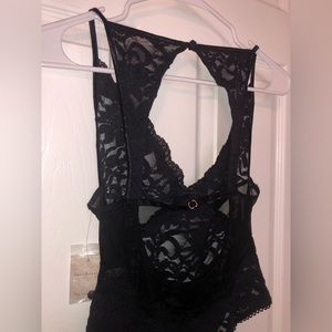 Black lace Free People body suit. Open back with adjustable straps across. Very cute high neck tank style. V neck in front. Whole thing is completely sheer lace and see through. Very cute! New with tags.