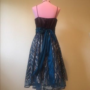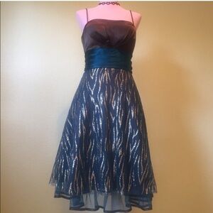 A wonderful addition to your wardrobe and your style! Unique piece with a nice shine! This dress has multiple layers some are mesh and is new and has never been worn. Removed tags but didn't have a chance to wear. Has a very cute ribbon to tie in bow in back or front as desired! Bottom half of dress has three layers! Great for a dances, proms, formal event, or a dance day out! Can be worn with the tiny straps or they can be tucked in and worn as strapless! Jump by Wendye Chaitlin