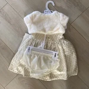 New with tag. 3 piece set. Size 3-6 Months. White/Gold metallic dress with fur overlay. Biscotti Baby collection.