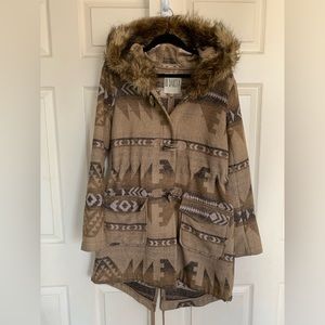Medium-weight coat featuring a tribal pattern, hood with faux fur trim, two patch pockets on hips, drawstring waist and hem, and front toggle and snap button closure. Unlined. By BB Dakota.