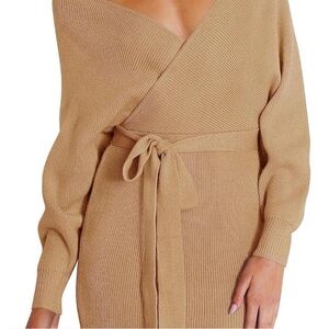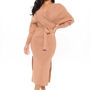 NWT FASHION NOVA TAN CAMEL MIDI BELTED SWEATER DRESS S