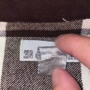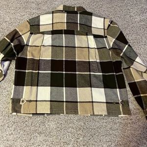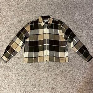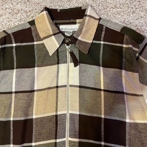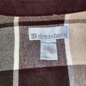 Dressbarn womens zipper jacket, plaid in brown/black/cream/tan, buttons on the sleeves and on the lower backside of jacket. In like new condition, size large, 100% cotton, machine wash cold