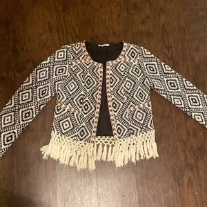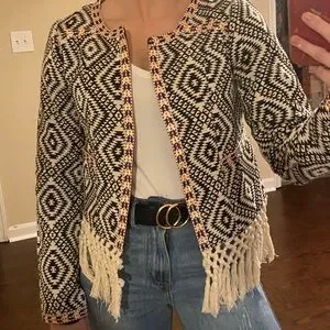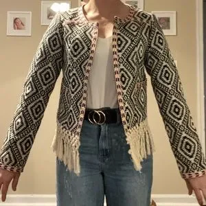 EUC! This jacket is everything! I searched and searched for it to get black and white so it would go with more. Perfect for fall and spring, lightweight, lined, two pockets. Looks great with cropped shirts or high waisted pants with a tucked shirt as shown