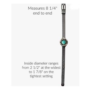 ~ The band measures 8 1/4" end to end and has inside diameter from 1 7/8" for the petite or child's wrist up to 2 1/2" at the widest hole.
