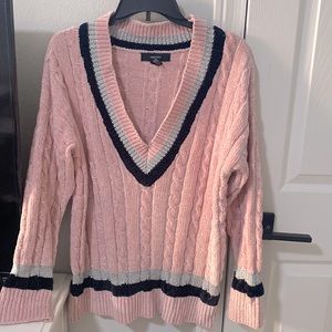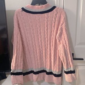 Long knit pink V neck sweater.