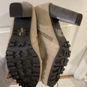 Sexy suede slide on boots. Excellent non-slip tread on bottom soles. Cushion inside for ultimate comfort. A couple of very tiny spots that may even come out as shown in picture. Genuine suede upper.