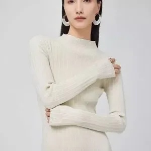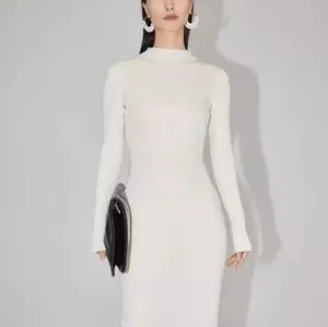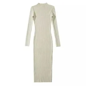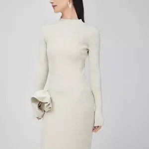 A minimalist ribbed knit dress in a trendy cream color with a flattering high neck and midi length skirt - A modern classic easy to wear casually or dressed up for a special occasion