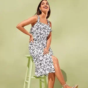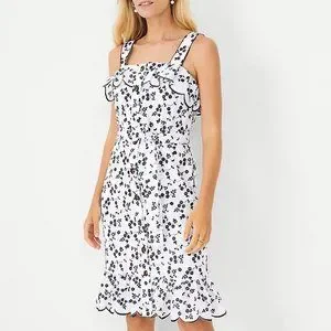 Top the best dressed list with our belted sheath, styled with a polished button front and embroidered floral print. Square neck with pleated ruffle. Sleeveless. Button front. Self tie belt. Ruffle hem. Lined.