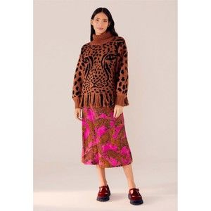 Farm Rio Leopard Fringe Sweater S Turtleneck Pullover Brown Black Knit Wool New