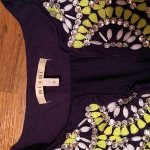 Cute blouse by Miami, size medium. Tunic style blouse with gem accents at neckline and waist. Top is lined and has cap style sleeves. There is also a button inside the neckline for a more conservative look.