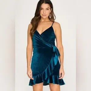 Beautiful Knit Stretch Velvet Wrap Dress With Side Tie in Teal Blue. Perfect for holiday parties, New Years Eve, weddings, or any special glam occasion.