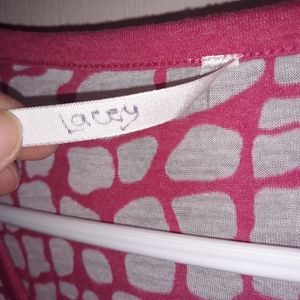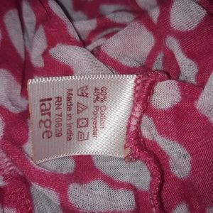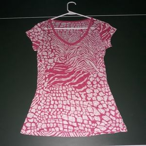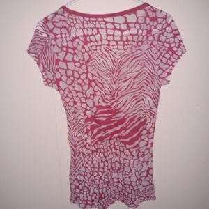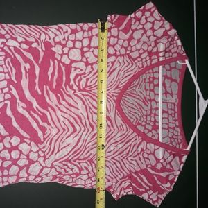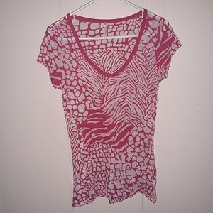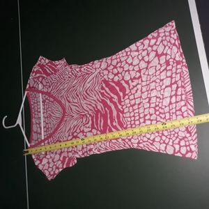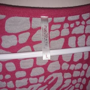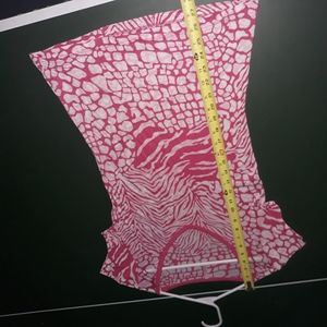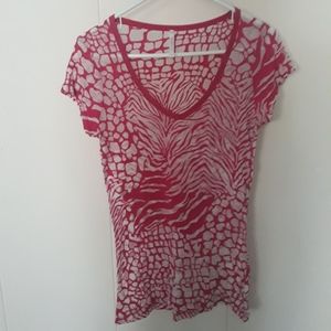 brand is rue21, size L, measurements in pictures, red and white animal print design, low neck, stretchy light weight material, tag reads lacey on back, sheer