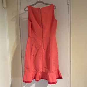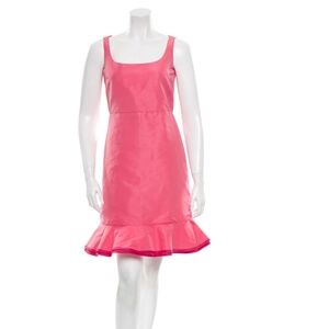 Pink woven Red Valentino sleeveless dress with ruffle detail at hem and exposed zip closure at center back.. Make a statement wearing this dress! Only worn a few times. Measurements: Bust 33”, Waist 28”, Hip 32”, Length 35.5”