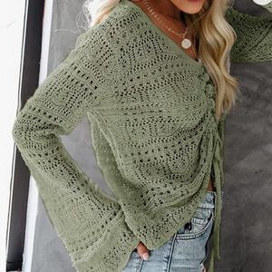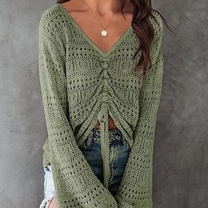 Features: long sleeve, hollow out, sheer, drawstrings for adjustment, bell sleeve, oversized, loose fit style, v neck sweater, hip length.