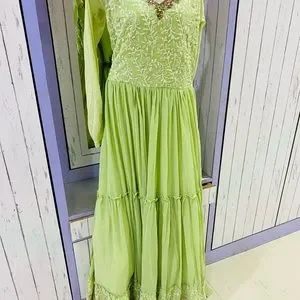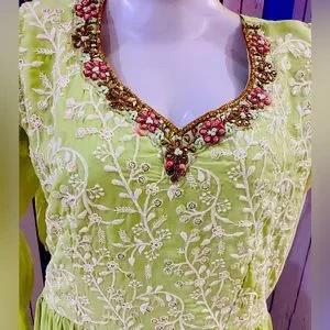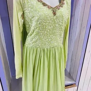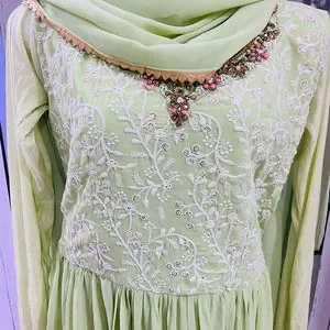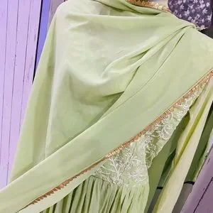 Fits well to 38 bust, floor length, around 60”, with dupatta with golden lace all around, an eye catcher!!