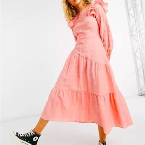 Brand new Topshop dress in a really vibrant coral, it’s really lovely, lightweight and comfortable. Unfortunately just doesn’t fit me. Great for a vacation look or a fun wedding guest dress or can be dressed down easily.