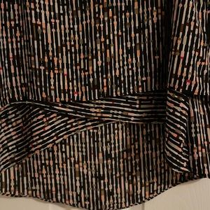 Pattern of light pink, cream, black and gray blocks. Stylish hi lo cut with tapering in the front, side slits and v neck. Wear alone or under a blazer. High quality.