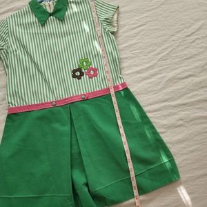 ADORABLE vintage green striped dress with floral applique from the 70s! Note hem let out but fine to be worn as is. This is a shorter dress or tunic. Please see all photos for condition and measurements Size: fits kids 8/10