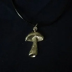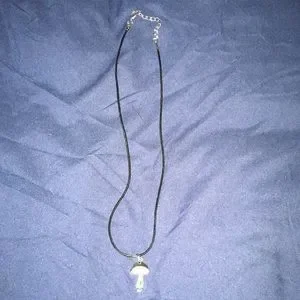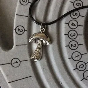 This is for a mushroom pendant necklace. Mushroom is around 2 inches. Silver toned. Set on a black wax covered adjustable necklace. Please refer to last pics for measurements. Necklace is around 22 inches at it’s longest.