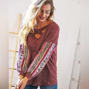 Upgrade your wardrobe with this fun and stylish criss cross detailed blouse. Tribal style printed bubble sleeves just keeps those cute details coming!
