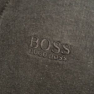 This casual navy blue quarter zip men’s sweatshirt from Hugo Boss is comfortable, fashionable, and versatile! It includes the Boss Hugo Boss logo embroidered into the upper chest on one side. The lining of the collar is navy and white striped, with a gold/bronze colored zipper in the front. 100% cotton. Great used condition.