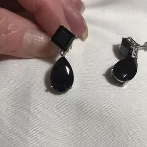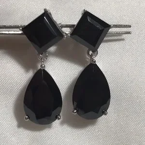 Large Black Spinel Earrings. Generous sized Pear cut Black Spinel dangle from a stationary square cut Black Spinel. Platinum over Sterling Silver. Black Spinel sparkles better than even a black diamond!!!! Perfect for those Holiday parties or if you like to wear bold earrings!!!! Jeans to Black tie wear!!! 20.75 ctw Spinel for Onyx prices. NWOT Happy Poshing!!!!