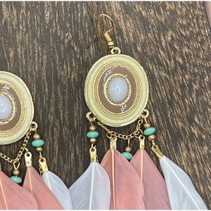 Bohemian Pink And White Feather Turquoise Beaded Earrings