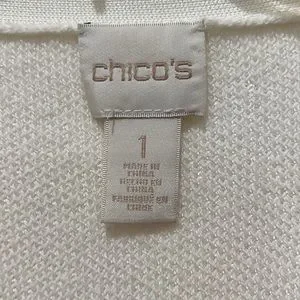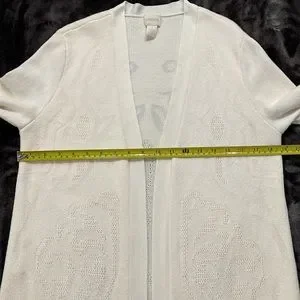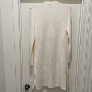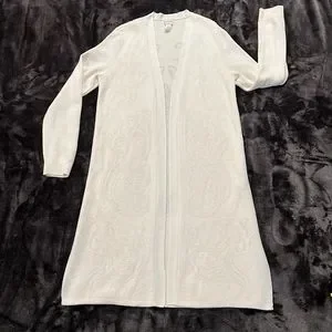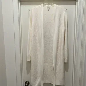 EUC Chico’s duster - longer length cardigan. Beautiful detailing with a subtle floral type design woven in and in excellent condition. A winter white or off-white in color and very soft. Chico’s size 1 which I believe equates to a size Medium. Very good quality. Please see photos for details and measurements.