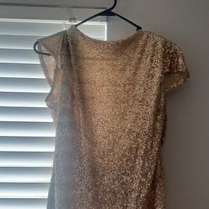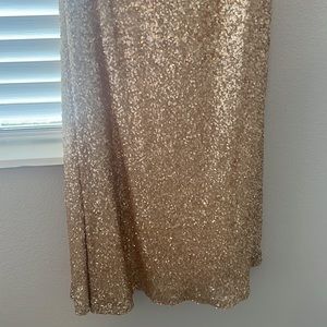 Sorella Vita champagne dress. Size 18 but taken in to fit me. 5’4” wearing 4 inch heels. Took in around the waist slightly as well. Does NOT fit like a size 18… closer to size 14. Worn once. Needs a good wash inside has some minor stains that will come out with a dry clean. No stains on the outside.